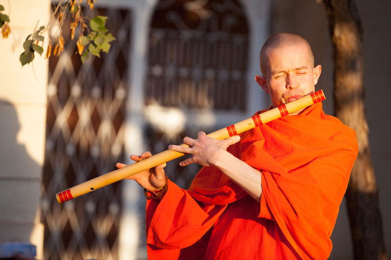 Practising sitting meditation and lying down relaxation with the sound of Indian bamboo flute (Bansuri) and Japanese Shakuhachi, led by Swami Madhuram Puri.