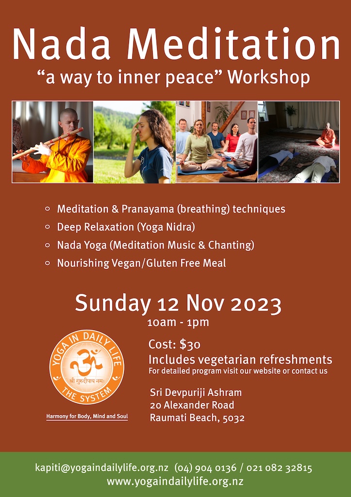 This is a Meditation Workshop where we will practise techniques of Nada Yoga Meditations. It involves quitening the mind with relaxation and listening to sounds of bells and flutes and chanting mantras, kirtans and bhajans.
